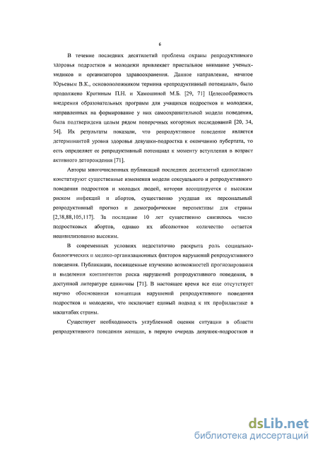 В течение последних десятилетий проблема охраны репродуктивного здоровья подростков и молодежи привлекает пристальное внимание ученых-медиков и организаторов здравоохранения (Кротин П.Н., Кожуховская Т.Ю., Таенкова А.А., 2004; Хамошина М.Б., 2005; Радзинский В.Е. и соавт., 2010; Алексеева Е.Г., 2013). Целесообразность внедрения образовательных программ для учащихся подростков и молодежи, направленных на формирование у них самоохранительной модели поведения, была подтверждена целым рядом поперечных когортных исследований (Журавлева И.В., 2004; Савельева И.С, 2004; Вострикова Т.В., 2009; Семятов СМ., 2009; Лебедева М.Г. и соавт., 2005). Их результаты показали, что репродуктивное поведение является одной из детерминант здоровья девушки-подростка к окончанию пубертата, то есть определяет ее репродуктивный потенциал к моменту вступления в возраст активного деторождения (Лебедева М.Г. и соавт., 2012). Авторы единогласно констатируют существенные изменения модели сексуального и репродуктивного поведения подростков и молодежи, которая ассоциируется с высоким риском инфекций и абортов, существенно ухудшая их персональный репродуктивный прогноз и демографические перспективы для страны
