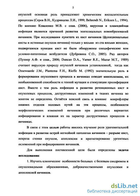 Наиболее высокий процент оперативных вмешательств в анамнезе (22,2%) отмечают женщины с опухолевидными образованиями яичников. Фолликулярные, лютеиновые, эндометриоидные кисты с нарушением целостности стенки или без неё формируют острый болевой синдром. Есть данные, что в развитии, как опухолевидных образований, так и истинных опухолей основная роль принадлежит хроническим воспалительным процессам (Серов В.Н., Кудрявцева Л.И., 1999; Behrendt N., Eriksen L., 1994). По мнению Коваленко М. В. с соавт. (2006), вирусная и хламидийная инфекция являются причиной развития эпителиальных новообразований яичников. При исследовании пунктата из кист яичников (функциональные кисты и истинные опухоли яичника) только у восьми из ста восьми женщин, подвергшихся пункции кист не были обнаружены специфические или условно-патогенные возбудители (Дубровина С.О., 2005). Ряд авторов (Пухнер А.Ф. и соавт., 2006; Duncan D.A., Varner R.E., Mazur M.T., 1989) считают вирусную природу опухолей яичников установленной, тогда как Ossewaarde J.M., Plantema F.H., Rieffe M. (1992) значительную роль в формировании опухолевого процесса в яичниках отводят микоплазмам, их необыкновенной способности к генной мутации и стимуляции пролиферации кист. Вместе с тем роль инфекции в развитии ретенционных кист и опухолевых процессов, деструктивных изменений в тканях яичника во многом не определена. Остаётся неясной связь и влияние микрофлоры нижних отделов половых путей на эти процессы, особенности морфологических изменений яичников при различных вариантах инфицирования и влияния их на характер деструктивных процессов в яичниках.