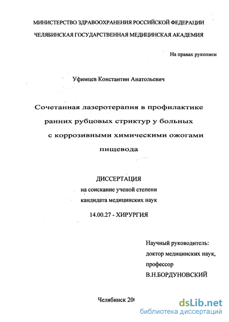 Изложенные выше обстоятельства послужили поводом проведения клинико-морфологического исследования, которое позволило бы выработать алгоритм лечения больных с химическими ожогами пищевода сочетанной методикой лазеротерапии низкоэнергетическим лазерным излучением, включающей в себя чрескожный и эндоскопический способ, с целью профилактики образования ранних Рубцовых стриктур пищевода, а также доказать необходимость подбора индивидуальной дозы облучения у каждого больного.