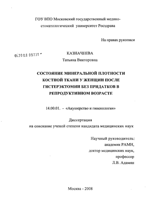 Основные положения диссертационной работы доложены на I международном конгрессе по репродуктивной медицине (8-12.07.06, Москва); на II международном конгрессе по репродуктивному здоровью семьи (21-24.01.08, Москва); на международной научно-практической конференции «Остеопороз: эпидемиология, клиника, диагностика, профилактика и лечение» (5-8.09.06 г. Евпатория); на конгрессах «Современные технологии в диагностике и лечении гинекологических заболеваний» в 2006 и 2007 гг., работа заняла II место на XXVIII Итоговой конференции молодых ученых МГМСУ. Зарегистрирована отраслевая разработка «База данных состояния минеральной плотности костной ткани у молодых женщин, перенесших гистерэктомию без придатков» (№ 50200600829).