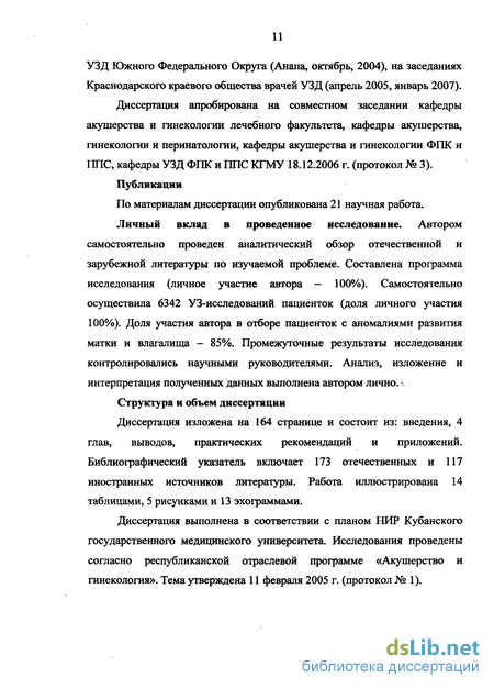 Личный вклад в проведенное исследование. Автором самостоятельно проведен аналитический обзор отечественной и зарубежной литературы по изучаемой проблеме. Составлена программа исследования (личное участие автора - 100%). Самостоятельно осуществила 6342 УЗ-исследований пациенток (доля личного участия 100%). Доля участия автора в отборе пациенток с аномалиями развития матки и влагалища - 85%. Промежуточные результаты исследования контролировались научными руководителями. Анализ, изложение и интерпретация полученных данных выполнена автором лично. \