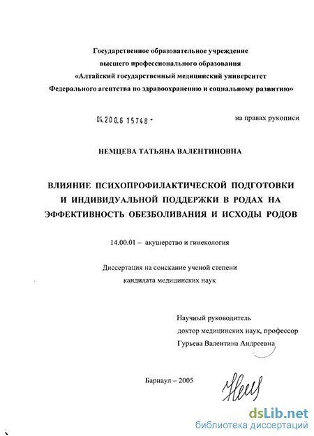 Немцева Татьяна Валентиновна. Влияние психопрофилактической подготовки и индивидуальной поддержки в родах на эффективность обезболивания и исходы в родах : диссертация ... кандидата медицинских наук : 14.00.01 / Немцева Татьяна Валентиновна; [Место защиты: ГОУВПО "Алтайский государственный медицинский университет"].- Барнаул, 2005.- 151 с.: ил.