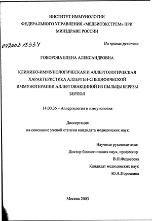 Говорова Елена Александровна. Клинико-иммунологическая и аллергологическая характеристика аллерген-специфической иммунотерапии аллерговакциной из пыльцы березы "Берпол" : диссертация ... кандидата медицинских наук : 14.00.36 / Говорова Елена Александровна; [Место защиты: Государственное предприятие Государственный научный центр "Институт иммунологии Федерального управления медико-биологических и экстремальных проблем"].- Москва, 2003.- 129 с.: ил.