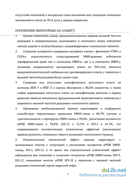 ПОЛОЖЕНИЯ, ВЫНОСИМЫЕ НА ЗАЩИТУ. ~ ~1; Пряма"взаймосвязь между продолжительностью периода высокой частоты рецидивов и направленностью цитокинового и клеточного ответа определяет тактику ведения и лечения больных с рецидивирующим генитальным герпесом.