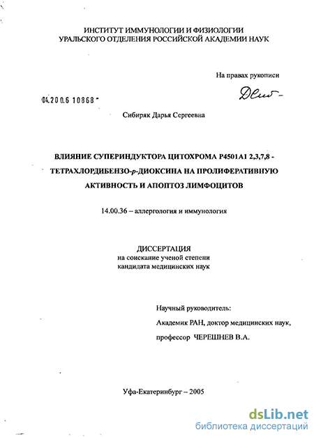 Впервые установлено, что ТХДД вызывает индукцию CYP1A1 -зависимой монооксигеназной активности, усиливает экспрессию белка CYP1A1, ингибирует пролиферативную активность и активационный апоптоз Т лимфоцитов периферической крови человека стимулированных антиСОЗ МКА, не изменяет активационно-индуцированную экспрессию CD25 и CD95 на CD4+ и CD8+ лимфоцитах, вызывает гипоэкспресию bcl-2 в активированных лимфоцитах. Влияние ТХДД на митогенез лимфоцитов связано не только с индукцией CYP1А1, но и с прямым влиянием на ферментативную активность эффекторных каспаз.