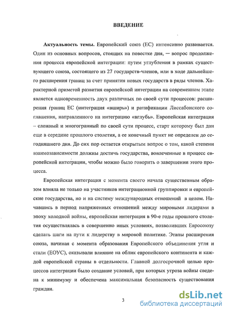 Актуальность темы. Европейский союз (ЕС) интенсивно развивается. Один из основных вопросов, стоящих на повестке дня, — вопрос продолжения процесса европейской интеграции: путем углубления в рамках существующего союза, состоящего из 27 государств-членов, или в ходе дальнейшего расширения границ за счет принятия новых государств в ряды членов. Характерной приметой развития европейской интеграции на современном этапе является одновременность двух различных по своей сути процессов: расширения границ ЕС (интеграция «вширь») и ратификации Лиссабонского соглашения, направленного на интеграцию «вглубь». Европейская интеграция - сложный и многогранный по своей сути процесс, старт которому был дан еще в середине прошлого столетия, а ее конечный пункт не определен до сегодняшнего дня. До сих пор остается открытым вопрос о том, какой степени взаимозависимости должны достичь государства, вовлеченные в процесс европейской интеграции, чтобы можно было говорить о завершении этого процесса.