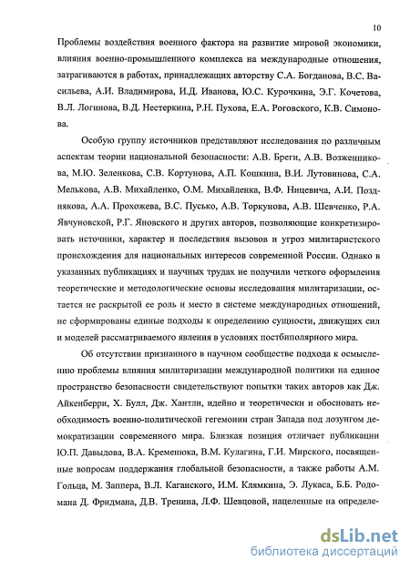 Особую группу источников представляют исследования по различным аспектам теории национальной безопасности: А.В.Бреги, А.В.Возженникова, М.Ю.Зеленкова, С.В.Кортунова, А.П.Кошкина, В.И.Лутовинова, С.А.Мелькова, А.В.Михайленко, О.М.Михайленка, В.Ф.Ницевича, А.И.Позднякова, А.А.Прохожева, В.С.Пусько, А.В.Торкунова, А.В.Шевченко, Р.А.Явчуновской, Р.Г.Яновского и других авторов, позволяющие конкретизировать источники, характер и последствия вызовов и угроз милитаристского происхождения для национальных интересов современной России. Однако в указанных публикациях и научных трудах не получили четкого оформления теоретические и методологические основы исследования милитаризации, остается не раскрытой ее роль и место в системе международных отношений, не сформированы единые подходы к определению сущности, движущих сил и моделей рассматриваемого явления в условиях постбиполярного мира.