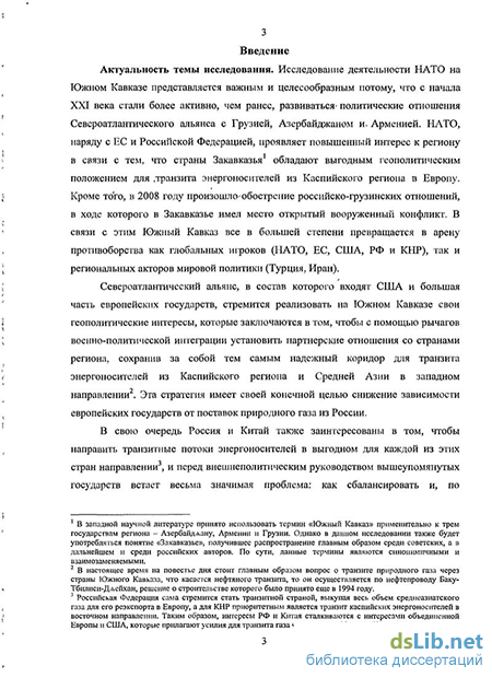 Актуальность темы исследования. Исследование деятельности НАТО на Южном Кавказе представляется важным и целесообразным потому, что с начала XXI века стали более активно, чем ранее, развиваться политические отношения Североатлантического альянса с Грузией, Азербайджаном и Арменией. НАТО, наряду с ЕС и Российской Федерацией, проявляет повышенный интерес к региону в связи с тем, что страны Закавказья1 обладают выгодным геополитическим положением для транзита энергоносителей из Каспийского региона в Европу. Кроме того, в 2008 году произошло обострение российско-грузинских отношений, в ходе которого в Закавказье имел место открытый вооруженный конфликт. В связи с этим Южный Кавказ все в большей степени превращается в арену противоборства как глобальных игроков (НАТО, ЕС, США, РФ и КНР), так и региональных акторов мировой политики (Турция, Иран).