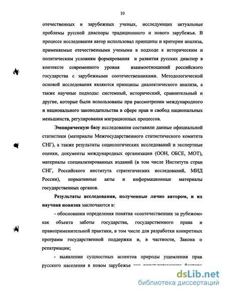 отечественных и зарубежных ученых, исследующих актуальные проблемы русской диаспоры традиционного и нового зарубежья. В процессе исследования автор использовал принципы и критерии анализа, применяемые отечественными учеными в подходе к историческим и политическим условиям формирования и развития русских диаспор в контексте современного уровня взаимоотношений российского государства с зарубежными соотечественниками. Методологической основой исследования являются принципы диалектического анализа, а также научные подходы: системный, исторический, сравнительный и другие, которые были использованы при рассмотрении международного и национального законодательства в сфере прав и свобод национальных меньшинств, регулирования миграционных процессов.