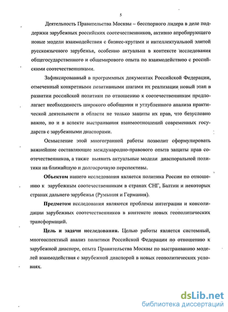 Цель и задачи исследования. Целью работы является системный, многоаспектный анализ политики Российской Федерации по отношению к зарубежным соотечественникам, степени их интеграции и консолидации в новых геополитических условиях.