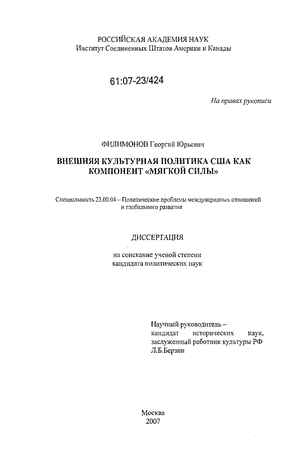 Таким образом, в диссертации предполагается рассмотреть методы, средства и механизмы реализации внешней культурной политики США на официальном и неофициальном уровнях.