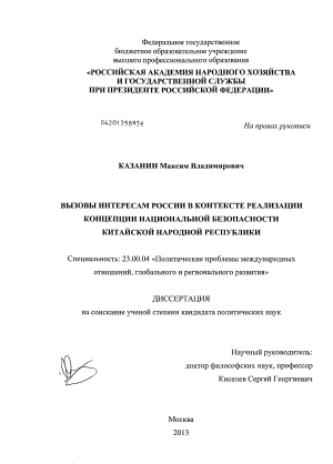 В числе немногочисленных диссертационных работ отметим исследование А.Б. Перцева, в котором выявлены основные направления оптимизации российско-китайского стратегического партнерства в контексте обеспечения национальной безопасности Российской Федерации. Однако практически отсутствуют диссертационные исследования, посвященные вызовам интересам России в связи с реализации Китаем своей концепции национальной безопасности на современном этапе.