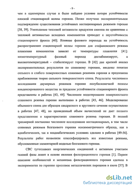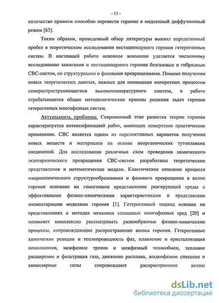 Таким образом, проведенный обзор литературы выявил определенный пробел в теоретическом исследовании нестационарного горения гетерогенных систем. В настоящей работе основное внимание уделяется численному исследованию зажигания и нестационарного горения безгазовых и гибридных СВС-систем, со структурными и фазовыми превращениями. Помимо получения новых теоретических данных, важных для понимания конкретных процессов самораспространяющегося высокотемпературного синтеза, в работе отрабатываются общие методологические приемы решения задач горения гетерогенных многофазных систем.