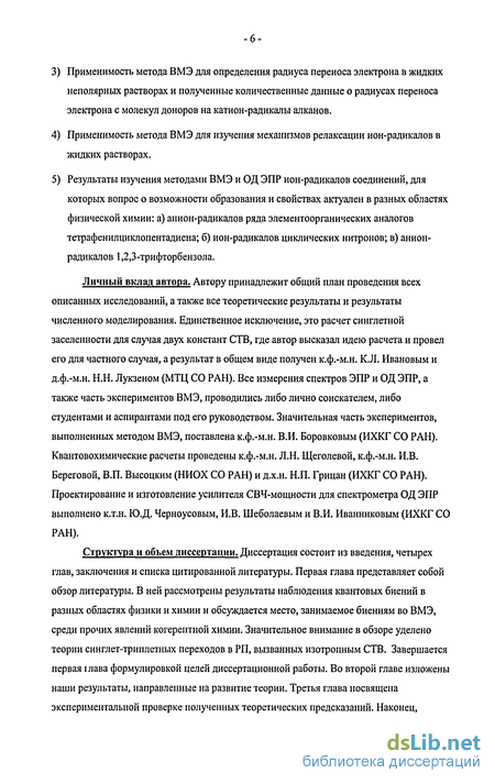 Личный вклад автора. Автору принадлежит общий план проведения всех описанных исследований, а также все теоретические результаты и результаты численного моделирования. Единственное исключение, это расчет синглетной заселенности для случая двух констант СТВ, где автор высказал идею расчета и провел его для частного случая, а результат в общем виде получен к.ф.-м.н. К.Л. Ивановым и д.ф.-м.н. Н.Н. Лукзеном (МТЦ СО РАН). Все измерения спектров ЭПР и ОД ЭПР, а также часть экспериментов ВМЭ, проводились либо лично соискателем, либо студентами и аспирантами под его руководством. Значительная часть экспериментов, выполненных методом ВМЭ, поставлена к.ф.-м.н. В.И. Боровковым (ИХКГ СО РАН). Квантовохимические расчеты проведены к.ф.-м.н. Л.Н. Щеголевой, к.ф.-м.н. И.В. Береговой, В.П. Высоцким (НИОХ СО РАН) и д.х.н. Н.П. Грицан (ИХКГ СО РАН). Проектирование и изготовление усилителя СВЧ-мощности для спектрометра ОД ЭПР выполнено к.т.н. Ю.Д. Черноусовым, И.В. Шеболаевым и В.И. Иванниковым (ИХКГ СО РАН).