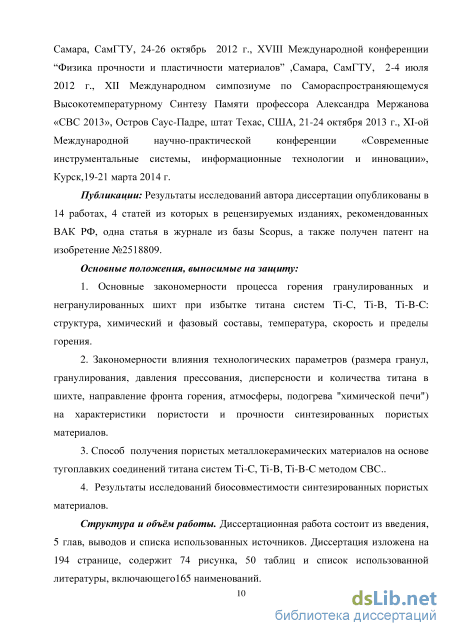 (СВС), в основе которой лежит реакция экзотермического взаимодействия двух или нескольких химических элементов, соединений, протекающие в режиме направленного горения. СВС дает возможность для получения целого ряда продуктов с комплексом уникальных эксплуатационных свойств. При этом СВС как метод получения пористых материалов соединяет в себе малую энергоемкость, возможность динамического варьирования структурных и иных свойств получаемых продуктов и безотходность. Эти предпосылки позволяют использовать экономичную и простую технологию для получения пористых керамических и металлокерамических изделий, в том числе и биосовместимых.