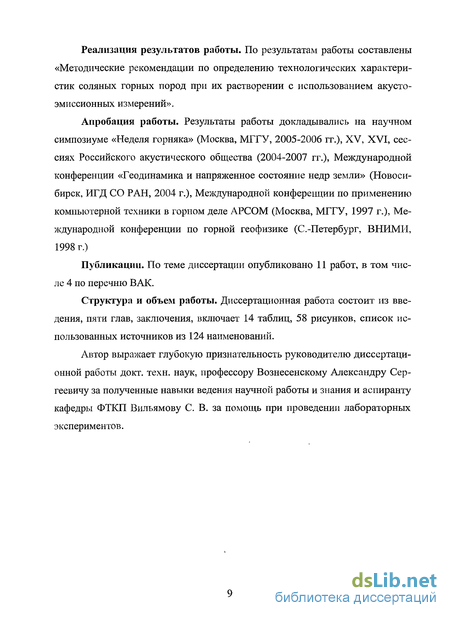 Апробация работы. Результаты работы докладывались на научном симпозиуме «Неделя горняка» (Москва, МГГУ, 2005-2006 гг.), XV, XVI, сессиях Российского акустического общества (2004-2007 гг.), Международной конференции «Геодинамика и напряженное состояние недр земли» (Новосибирск, ИГД СО РАН, 2004 г.), Международной конференции по применению компьютерной техники в горном деле АРСОМ (Москва, МГГУ, 1997 г.), Международной конференции по горной геофизике (С.-Петербург, ВНИМИ, 1998 г.)