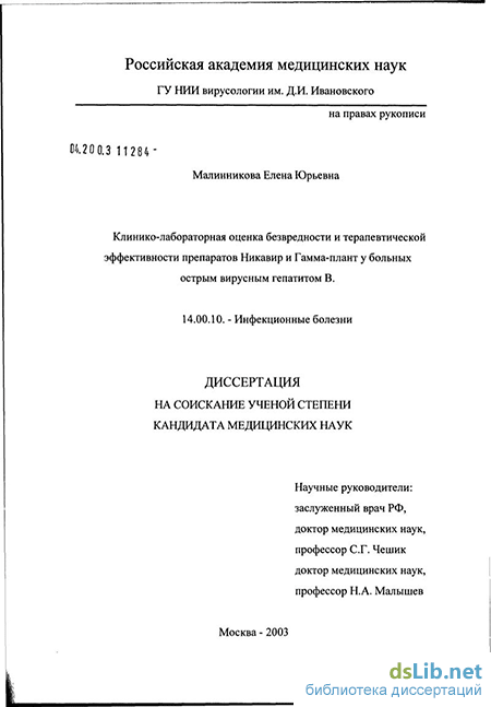 Малинникова Елена Юрьевна. Клинико-лабораторная оценка безвредности и терапевтической эффективности новых препаратов "Никавир" и "Гамма-плант" у больных острым вирусным гепатитом В (ОГВ) : диссертация ... кандидата медицинских наук : 14.00.10 / Малинникова Елена Юрьевна; [Место защиты: Государственное учреждение "Научно-исследовательский институт вирусологии РАМН"].- Москва, 2003.- 169 с.: ил.