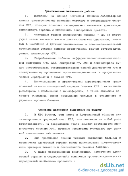 нальной способности тромбоцитов, разработка дифференциально-диагностических критериев с «рядом природно-очаговых заболеваний, изучение эффективности противовирусного препарата рибавирина в комбинации с циклофероном, а также амиксина в комплексном лечении больных КГЛ.