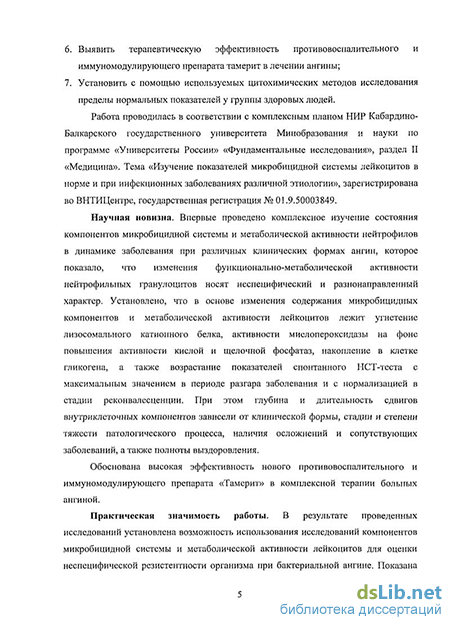 Практическая значимость работы В результате проведенных исследований установлена возможность использования исследований компонентов микробицидной системы и метаболической активности лейкоцитов для оценки неспецифической резистентности организма при бактериальной ангине. Показана перспективность исследований внутриклеточных компонентов нейтрофильных гранулоцитов и показателей спонтанного НСТ-теста лейкоцитов в качестве критерия для оценки степени тяжести патологического процесса, наличия осложнений и сопутствующих заболеваний, прогнозирования исходов, а также полноты выздоровления. Практическое значение имеет высокая эффективность нового противовоспалительного и иммуномодулирующего препарата «Тамерит» в комплексной терапии ангин Получены «стандарты» нормальных показателей внутриклеточных компонентов и метаболической активности лейкоцитов, которые могут быть использованы, как критерии при проведении и оценке цитохимических и цитоиммунологиче-ских исследований с помощью использованных методик