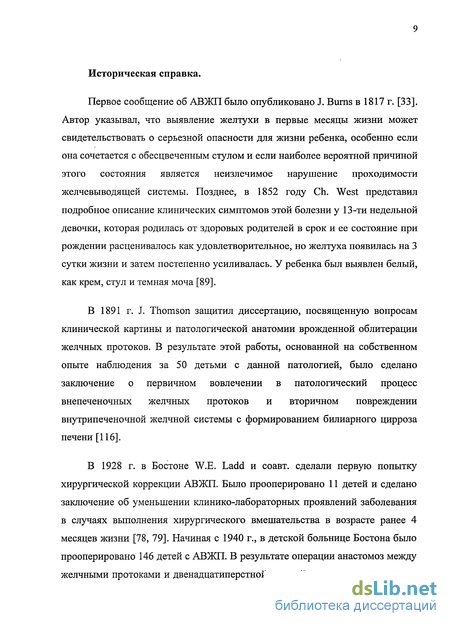 В 1891 г. J. Thomson защитил диссертацию, посвященную вопросам клинической картины и патологической анатомии врожденной облитерации желчных протоков. В результате этой работы, основанной на собственном опыте наблюдения за 50 детьми с данной патологией, было сделано заключение о первичном вовлечении в патологический процесс внепеченочных желчных протоков и вторичном повреждении внутрипеченочной желчной системы с формированием билиарного цирроза печени [116].