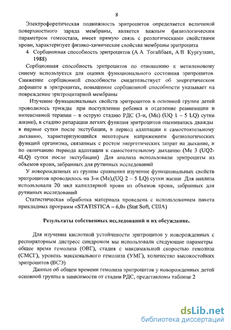 Важным фактором в развитии гипоксии при РДС является нарушение кислородтранспортной функции эритроцитов Тем не менее, функциональная активность эритроцитов при развитии тяжелого РДС у новорожденных изучена недостаточно Прежде всего, это касается изучения функционального состояния периферического отдела эритрона кислотной устойчивости эритроцитов, потребления глюкозы эритроцитами, сорбционной способности эритроцитов и их электрокииетических свойств Остается неясным вопрос о роли нарушения функциональной активности эритроцитов в развитии тяжелого РДС, требующего применения искусственной вентиляции легких Практически не исследована функциональная активность эритроцитов в зависимости от стадии тяжелого респираторного дистресс синдрома