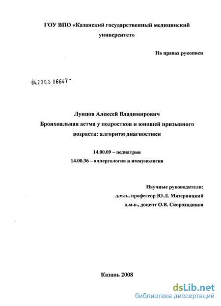 Апробация работы. Материалы диссертации доложены и обсуждены на II и IV Региональной научно-практической конференции «Педиатрия и детская хирургия в Приволжском федеральном округе» (Казань, 2005; 2007), XI Всероссийской научно-практической конференции "Молодые ученые в медицине" (Казань, 2006; диплом II степени), Национальных конгрессах по болезням органов дыхания (Санкт-Петербург, 2006; Казань, 2007), X Всероссийском Форуме с международным участием им. акад. В.И. Иоффе «Дни иммунологии в Санкт-Петербурге» (Санкт-Петербург, 2006), Европейской аллергологической школе EAACI Summer school (Халкидики, Греция, 2006), Всероссийской научно-практической конференции «Актуальные вопросы заболеваний органов дыхания у детей и подростков» (Нижний Новгород, 2007), VI Всероссийском Конгрессе «Современные технологии в педиатрии и детской хирургии» (Москва, 2007), расширенном заседании предметной проблемной комиссии по актуальным вопросам материнства и детства совместно с кафедрой клинической иммунологии с аллергологией ГОУ ВПО «Казанский государственный медицинский университет» (Казань, 2007).