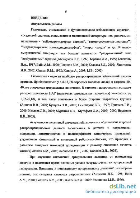 При изучении отклонений артериального давления (АД) от нормальных величин в настоящее время основные усилия сосредоточены на артериальной гипертензии. Первичная артериальная гипотензия у детей и подростков не изучалась столь глубоко и разносторонне как проблема артериальной гипертонии (Баранов А.А., 1999; Босенко А.И., 1997; Гембицкий Е.В., 1997; Калоева З.Д., 1993; Олесен Дж. 1996).