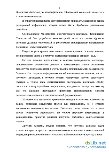 Паттерн дыхания предлагается в качестве интегрального параметра, описывающего клинические данные и позволяющего также реализовать развернутое прогнозирование с учетом именно индивидуальных особенностей больного. Он содержит информацию как об интенсивности дыхания, так и о частотном диапазоне, в котором каждый конкретный паттерн существует. Паттерн, а точнее зона, диагностически достоверных признаков (25,39) относится к классу случайных стационарных, эргодических процессов, поэтому для его описания необходимо привлекать математический аппарат статистических методов в соответствующей формулировке.