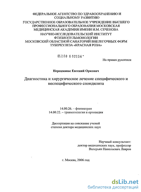 Клиника остеомиелита позвоночника весьма разнообразна и зависит от многих причин - реактивности организма, вирулентности возбудителя, состояния систем гомеостаза и других (Ч.А. Али-Заде, 2002). От первых клинических проявлений заболевания до установления диагноза по данным большинства авторов проходит от 1-3 месяцев до 1,5-2 лет (А.Н. Горячев, Л.С. Попов, С.Н. Туморин, 1997; В.Ф. Кузнецов, 1991; Г.Т. Малюков, 1994; В.П. Селиванов, 1988; С.А. Тиходеев, 1994; В.Я. Фищенко, 1983). Классическое начало гематогенного остеомиелита позвоночника обычно острое, с высокой температурой. Однако все больше авторов приводят данные о стертой клинике остеомиелита позвоночника, с субфебрильной температурой, неярко выраженными болями (В.Н. Лавров, 1989; А.С. Червонный, 1977; И.П. Ар-дашев, 2001). Объясняется это изменение клинической картины прежде всего распространенной практикой применения антибактериальных препаратов при всех заболеваниях, сопровождающихся подъемом температуры. Такая, не всегда обоснованная, терапия антибиотиками, зачастую в недостаточно эффективных дозах и непродолжительное время, по мнению многих авторов, не обрывает остеомиелитический процесс, а делает его течение вялым, хроническим, нередко атипично протекающим (С.А. Рейнберг, 1964; Л.С. Рабинович, 1970; А.С. Червонный, 1977; В.Н. Лавров и соавт., 1989). Стертая клиническая картина значительно осложняет дифференциальную диагностику остеомиелита позвоночника, особенно с туберкулезным спондилитом, кото 19 рый протекает с практически такими же симптомами и сходной рентгенологической картиной. В связи с этим, большое количество больных остеомиелитом позвоночника сосредоточено в костнотуберкулезных стационарах и лечение этих больных стало обычной практикой фтизиоортопедов.