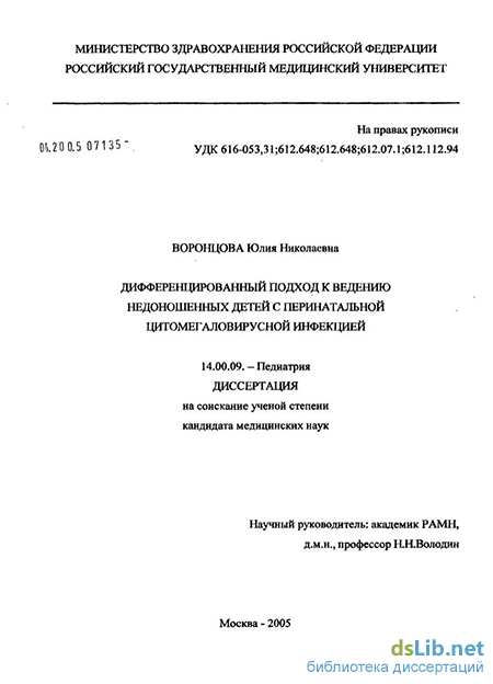 Воронцова Юлия Николаевна. Дифференцированный подход к ведению недоношенных детей с перинатальной цитомегаловирусной инфекцией : диссертация ... кандидата медицинских наук : 14.00.09 / Воронцова Юлия Николаевна; [Место защиты: Государственное учреждение "Научно-исследовательский институт детской гематологии"].- Москва, 2005.- 137 с.: ил.