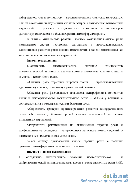 В соответствии с этим, целью данного исследования явилась комплексная оценка роли компонентов систем протеолиза, фагоцитоза и провоспалительных адипокинов в развитии рожи нижних конечностей, а так же оптимизация ее терапии на основе выявленных нарушений.