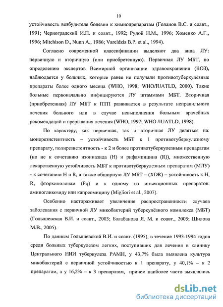 Применяемая в настоящее время стандартная химиотерапия у впервые выявленных больных предусматривает назначение препаратов основного ряда, к которым в значительном числе случаев выявляется устойчивость возбудителя туберкулеза. Традиционные микробиологические методы позволяют диагностировать первичную лекарственную устойчивость (ЛУ) микобактерии лишь к окончанию интенсивной фазы химиотерапии, что оказывает неблагоприятное влияние на течение заболевания и его исходы. Известно, что неадекватная терапия больных, выделяющих лекарственно устойчивые МБТ, неэффективна и может привести к развитию вторичной устойчивости возбудителя к ранее действенным препаратам. В результате подобной терапии повышается риск развития прогрессирующих форм туберкулеза и формирования резервуара особо опасной лекарственно резистентной туберкулезной инфекции (Васильева И.А., 2002; Мишин В.Ю., 2002; Bastian I., Portaels F., 2000).