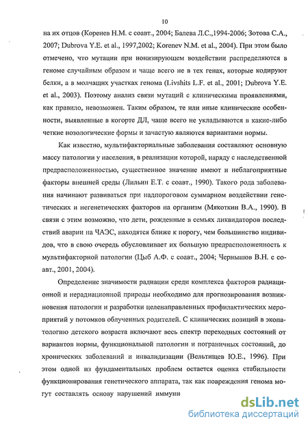 10 на их отцов (Коренев Н.М. с соавт., 2004; Балева Л.С., 1994-2006; Зотова С.А., 2007; Dubrova Y.E. et al., 1997,2002; Korenev N.M. et al., 2004). При этом было отмечено, что мутации при ионизирующем воздействии распределяются в геноме случайным образом и чаще всего не в тех генах, которые кодируют белки, а в молчащих участках генома (Livshits L.F. et al., 2001; Dubrova Y.E. et al., 2003). Поэтому анализ связи мутаций с клиническими проявлениями, как правило, невозможен. Таким образом, те или иные клинические особенности, выявленные в когорте ДЛ, чаще всего не укладываются в какие-либо четкие нозологические формы и зачастую являются вариантами нормы.