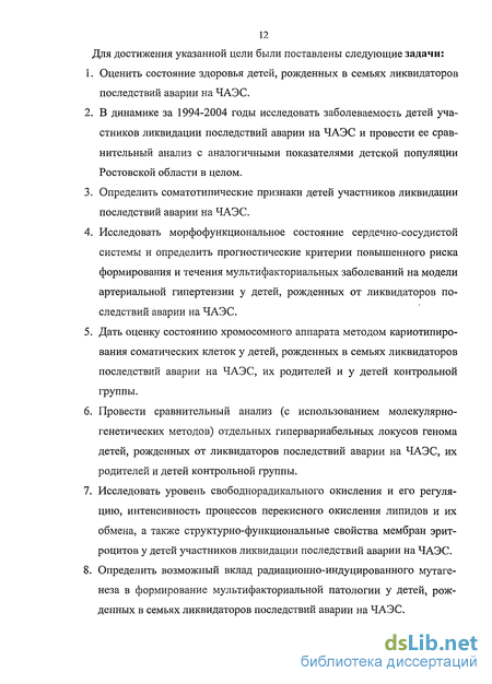 В связи с вышеизложенным целью настоящей работы явилось исследование медико-генетических основ и динамики формирования здоровья детей участников ликвидации последствий аварии на ЧАЭС для дальнейшего совершенствования существующих и разработки новых подходов к прогнозированию и профилактике мультифакториальных заболеваний в этой когорте детей.