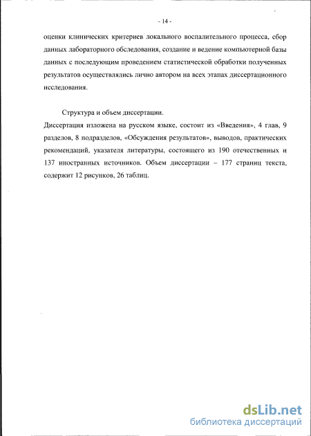 Личный вклад диссертанта. Курация пациентов с получением информированного согласия на участие в научном исследовании, разработка индивидуальной клинико-лабораторной карты пациента и балльной системы оценки клинических критериев локального воспалительного процесса, сбор данных лабораторного обследования, создание и ведение компьютерной базы данных с последующим проведением статистической обработки полученных результатов осуществлялись лично автором на всех этапах диссертационного исследования.