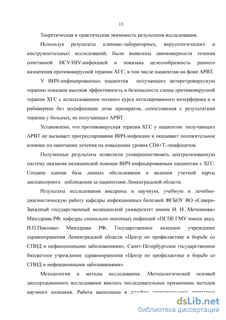 Широкая распространенность HCV у ВИЧ-инфицированных пациентов, быстрое прогрессирование ХГС при выраженном иммунодефиците и негативное влияние на эффективность антиретровирусной терапии, немногочисленность и разноречивость данных о влиянии АРВТ на эффективность и безопасность лечения ХГС, определяют высокую актуальность выбранной темы диссертационной работы.