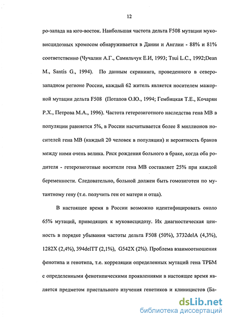 В настоящее время в России возможно идентифицировать около 65% мутаций, приводящих к муковисцидозу. Их диагностическая ценность в порядке убывания частоты дельта F508 (50%), 3732delA (4,3%), 1282Х (2,4%), 394delTT (2,1%), G542X (2%). Проблема взаимоотношения фенотипа и генотипа, т.е. корреляции определенных мутаций гена ТРБМ с определенными фенотипическими проявлениями в настоящее время является предметом пристального изучения генетиков и клиницистов (Ба 13 кай М.А., 1998; Петрова Н.В. Гинтер Е.К., 2001; Littewood J.M. 1986; Dork N., Wilbrand Т., Neumann N. et al., 1991).