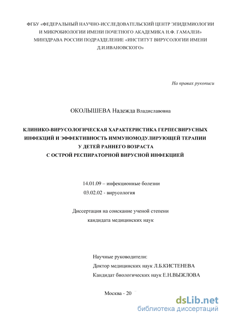Основанием для проведения диссертационного исследования послужила актуальность ГВИ у детей раннего возраста для педиатрической практики. Существенный вклад в изучение проблем этиологии, диагностики, клиники и терапии герпесвирусных инфекций у детей внесли В.А. Анохин, И.В.Бабаченко, Л.В.Вашура, Л.Б. Кистенева, Э.Н. Симованьян, Ф.С. Харламова, Т.А. Чеботарева, С.Г. Чешик, В.Ф.Учайкин, О.В. Шамшева, D.Lilleri, C.Martin-Gandul и другие.