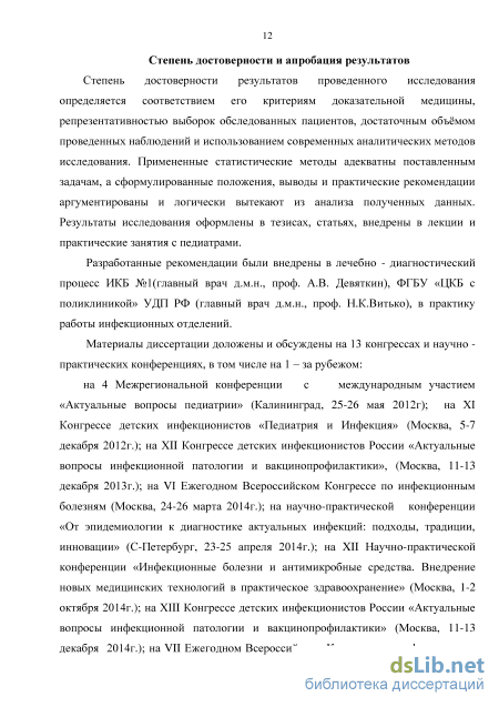 2012г); на ХI Конгрессе детских инфекционистов «Педиатрия и Инфекция» (Москва, 5-7 декабря 2012г.); на ХII Конгрессе детских инфекционистов России «Актуальные вопросы инфекционной патологии и вакцинопрофилактики», (Москва, 11-13 декабря 2013г.); на VI Ежегодном Всероссийском Конгрессе по инфекционным болезням (Москва, 24-26 марта 2014г.); на научно-практической конференции «От эпидемиологии к диагностике актуальных инфекций: подходы, традиции, инновации» (С-Петербург, 23-25 апреля 2014г.); на XII Научно-практической конференции «Инфекционные болезни и антимикробные средства. Внедрение новых медицинских технологий в практическое здравоохранение» (Москва, 1-2 октября 2014г.); на ХIII Конгрессе детских инфекционистов России «Актуальные вопросы инфекционной патологии и вакцинопрофилактики» (Москва, 11-13 декабря 2014г.); на VII Ежегодном Всероссийском Конгрессе по инфекционным болезням с международным участием (Москва, 30 марта -1 апреля 2015г.); на Всероссийском ежегодном конгрессе «Инфекционные болезни у детей: диагностика, лечение и профилактика» (С-Петербург, 9-10 октября 2015г.); на международном конгрессе Европейского респираторного общества (European Respiratory society, International Congress) (Amsterdam, 26-30 September 2015г.); на ХIV Конгрессе детских инфекционистов России «Актуальные вопросы инфекционной патологии и вакцинопрофилактики» (Москва, 10-12 декабря 2015г.); на VIII Ежегодном Всероссийском Конгрессе по инфекционным болезням с международным участием (Москва, 28 марта -30 марта 2016г.); на XV Российском конгрессе «Инновационные технологии в педиатрии и детской хирургии» (Москва, 25-27 октября 2016 г.).