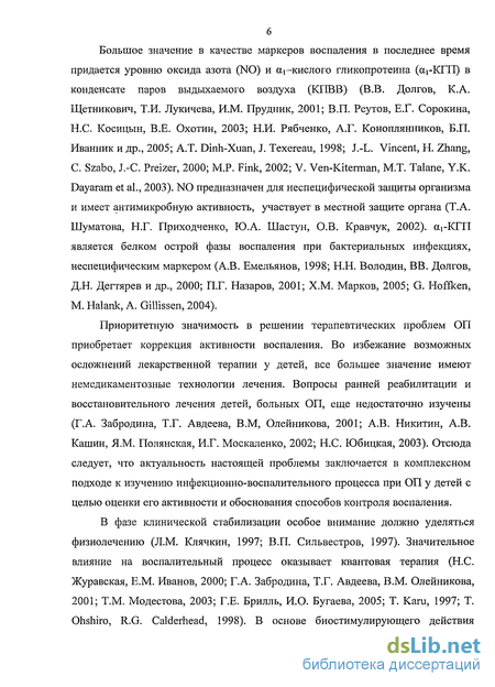 Приоритетную значимость в решении терапевтических проблем ОП приобретает коррекция активности воспаления. Во избежание возможных осложнений лекарственной терапии у детей, все большее значение имеют немедикаментозные технологии лечения. Вопросы ранней реабилитации и восстановительного лечения детей, больных ОП, еще недостаточно изучены (Г.А. Забродина, Т.Г. Авдеева, В.М, Олейникова, 2001; А.В. Никитин, А.В. Кашин, Я.М. Полянская, И.Г. Москаленко, 2002; Н.С. Юбицкая, 2003). Отсюда следует, что актуальность настоящей проблемы заключается в комплексном подходе к изучению инфекционно-воспалительного процесса при ОП у детей с целью оценки его активности и обоснования способов контроля воспаления.