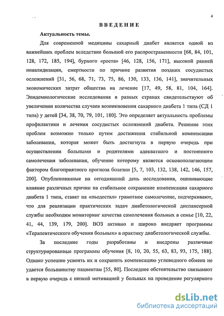 Для современной медицины сахарный диабет является одной из важнейших проблем вследствие большой его распространенности [68, 84, 101, 128, 172, 185, 194], бурного «роста» [46, 128, 156, 171], высокой ранней инвалидизации, смертности по причине развития поздних сосудистых осложнений [31, 56, 68, 71, 73, 75, 86, 130, 133, 136, 141], значительных экономических затрат общества на лечение [17, 49, 58, 81, 104, 164]. Эпидемиологические исследования в разных странах свидетельствуют об увеличении количества случаев возникновения сахарного диабета 1 типа (СД 1 типа) у детей [34, 38, 70, 79, 101, 180]. Это определяет актуальность проблемы профилактики и лечения сосудистых осложнений диабета. Решение этих проблем возможно только путем достижения стабильной компенсации заболевания, которая может быть достигнута в первую очередь при осуществлении больными и родителями адекватного и постоянного самолечения заболевания, обучение которому является основополагающим фактором благоприятного прогноза болезни [5, 7, 103, 132, 138, 142, 146, 157, 200]. Опубликованные на сегодняшний день исследования, оценивающие влияние различных причин на стабильное сохранение компенсации сахарного диабета 1 типа, ставят на «пьедестал» грамотное самолечение, подчеркивают, что для реализации практических задач диабетологической диспансерной службы необходим мониторинг качества самолечения больных в семье [10, 22, 41, 44, 139, 179, 200]. ВОЗ активно и широко внедряет программы «Терапевтического обучения больных» в практику диабетологической службы.