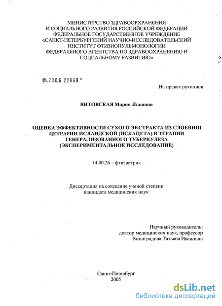 4. Иммунотропная направленность действия сухого экстракта из слоевищ цетрарии исландской вносит существенный вклад в улучшение результатов полихимйотерапии экспериментального туберкулеза за счет повышения пролиферации спленоцитов и продукции ими ИЛ-2, стимуляции фагоцитоза и генерации супероксиданиона перитонеальными макрофагами.