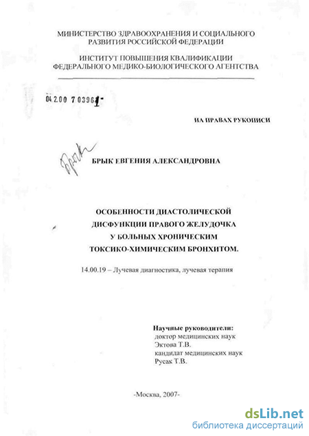 Доказано, что диастолическая дисфункция правого желудочка у больных хроническим токсико-химическим бронхитом развивается раньше его гипертрофии и выражена в большей степени, чем у больных хроническим обструктивным бронхитом.