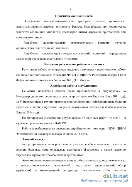 Автором лично проведена оценка клинико-биохимических, вирусологических и гемостазиологических показателей; подготовлен аналитический обзор зарубежной и отечественной литературы, осуществлен отбор методов исследования и статистическая обработка полученных результатов; проведен анализ и интерпретация данных, сформулированы выводы, научная новизна и практические рекомендации.