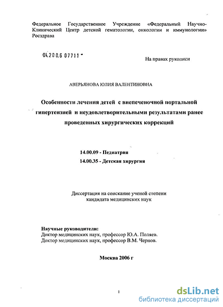 Аверьянова Юлия Валентиновна. Особенности лечения детей с внепеченочной портальной гипертензией и неудовлетворительными результатами ранее проведенных хирургических коррекций : диссертация ... кандидата медицинских наук : 14.00.09 / Аверьянова Юлия Валентиновна; [Место защиты: ФГУ "Федеральный научно-клинический центр детской гематологии, онкологии и иммунологии Росздрава"].- Москва, 2006.- 127 с.: ил.