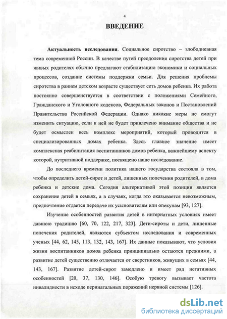 В целях реализации законодательства Российской Федерации по охране прав детей-сирот и детей, оставшихся без попечения родителей, в сиротских учреждениях осуществляется комплексная медико-психолого-педагогическая реабилитация, оптимизированы нормы питания (Лильин Е.Т., 2002) Тем не менее, многие воспитанники домов ребенка имеют выраженные нарушения пищевого статуса, и после окончания периода раннего детства переводятся на полное государственное обеспечение в преемственные сиротские учреждения из-за инвалидности (Свинцов А А , 1998)