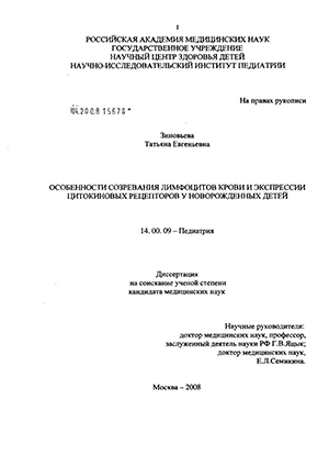 Внедрение результатов работы в практику и публикации. На основании результатов настоящего исследования, разработан протокол иммунофенотипирования лимфоцитов крови, с учетом экспрессии цитокиновых рецепторов у новорожденных детей, который был внедрен и используется в отделении для недоношенных детей НИИ педиатрии ГУ НЦЗД РАМН с 2007 года