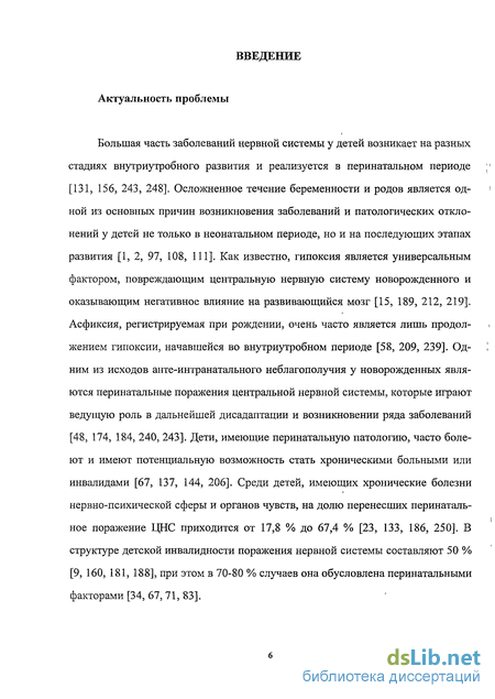 Большая часть заболеваний нервной системы у детей возникает на разных стадиях внутриутробного развития и реализуется в перинатальном периоде [131, 156, 243, 24В]. Осложненное течение беременности и родов является одной из основных причин возникновения заболеваний и патологических отклонений у детей не только в неонатальном периоде, но и на последующих этапах развития [1, 2, 97, 108, 111]. Как известно, гипоксия является универсальным фактором, повреждающим центральную нервную систему новорожденного и оказывающим негативное влияние на развивающийся мозг [15, 189, 212, 219]. Асфиксия, регистрируемая при рождении, очень часто является лишь продолжением гипоксии, начавшейся во внутриутробном периоде [58, 209, 239]. Одним из исходов анте-интранатального неблагополучия у новорожденных являются перинатальные поражения центральной нервной системы, которые играют ведущую роль в дальнейшей дисадаптации и возникновении ряда заболеваний [48, 174, 184, 240, 243]. Дети, имеющие перинатальную патологию, часто болеют и имеют потенциальную возможность стать хроническими больными или инвалидами [67, 137, 144, 206]. Среди детей, имеющих хронические болезни нервно-психической сферы и органов чувств, на долю перенесших перинатальное поражение ЦНС приходится от 17,8 % до 67,4 % [23, 133, 186, 250]. В структуре детской инвалидности поражения нервной системы составляют 50 % [9, 160, 181, 188], при этом в 70-80 % случаев она обусловлена перинатальными факторами [34, 67, 71, 83].