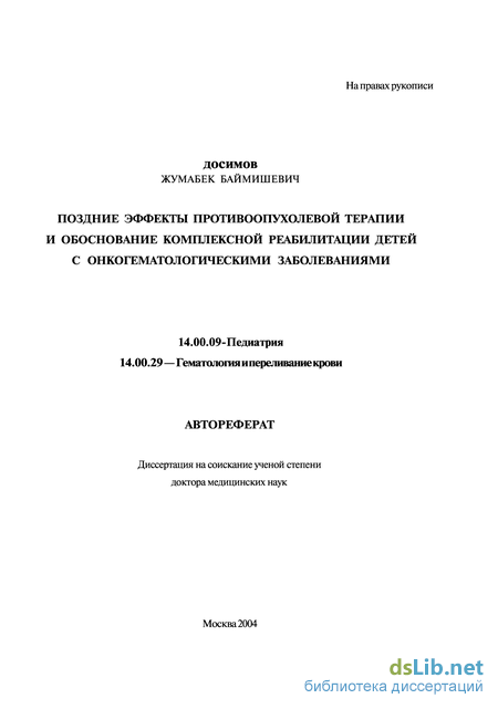 Вместе с тем в периоде длительной ремиссии ЗН у детей выявляются различные осложнения, обозначаемые в онкогематологической практике как поздние эффекты противоопухолевого лечения, клинико-морфологическая и прогностическая сущность которых определяется повреждением структуры и функции различных органов и систем. В этой связи медицинские проблемы больных со ЗН последовательно смещаются из сферы компетенции онкогематологов в область профессиональных интересов педиатров и специалистов педиатрических дисциплин. Данная тенденция еще более очевидна в связи с тем, что тяжелое длительное заболевание и специфика противоопухолевой терапии оказывают негативное влияние на психо-эмоциональный статус ребенка, естественные процессы становления социального опыта и в конечном итоге способствуют психологической и социальной дезадаптации пациентов (Моисеенко Е.И., 1997; Цейтлин ГЛ., 2001; Калыкбаева А.Ш., 2001).