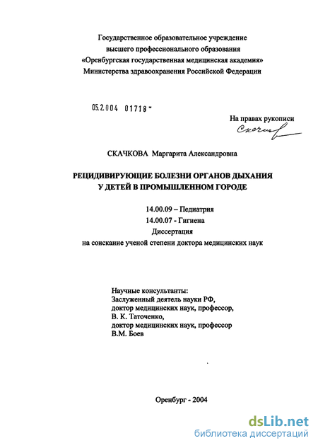 Работа выполнена в Оренбургской государственной медицинской академии (ректор - доктор медицинских наук, профессор С.А. Павловичев) на кафедрах общей и коммунальной гигиены с экологией человека (заведующий - доктор медицинских наук, профессор В.М. Боев), госпитальной педиатрии, в проблемной научно-исследовательской лаборатории по изучению механизмов естественного иммунитета Оренбургской государственной медицинской академии (зав.- доктор медицинских наук, профессор А.И. Смолягин), в иммунологической лаборатории Научного Центра акушерства, гинекологии и перинатологии